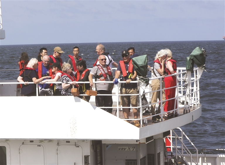 6月18日下午2时30分,载着16位“里斯本丸”营救事件亲历者后代的海巡艇鸣笛致意,甲板上响起了英国葬礼曲“Sleep Dearie Sleep”,16位“里斯本丸”亲历者后代聚集在甲板,面朝南方,神情肃穆。他们手持装有玫瑰花和白菊花的花篮,把花瓣撒向海面(见图2)。