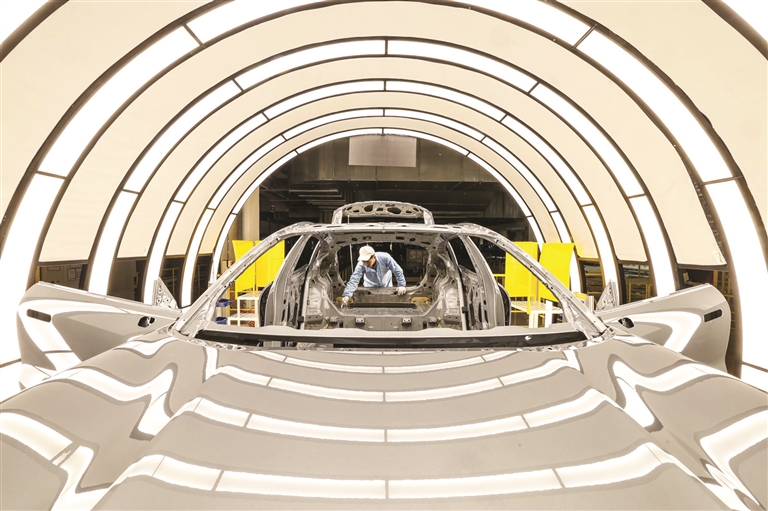 823台焊接机器人上下挥臂,操作行云流水,尽显严谨有序的工业之美。一台台矮矮方方的AGV小车拖运着各种物料穿行其中,相互配合严丝合缝。走进高约12米、占地10万平方米的总装车间,每条生产线都“标配”显示屏、机械臂、AGV小车等,却见不到多少操作工人。