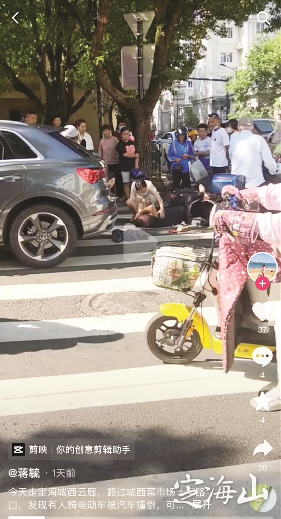 事发时,章钱波刚好路过城西农贸市场,发现有人躺在斑马线上,双腿被电动自行车压着,双手抱头,呢喃着说自己头不舒服。