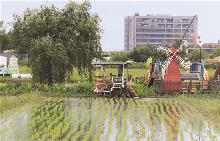 昨天,在普陀田园综合体农田内,农机手正驾驶着插秧机栽插水稻秧苗。