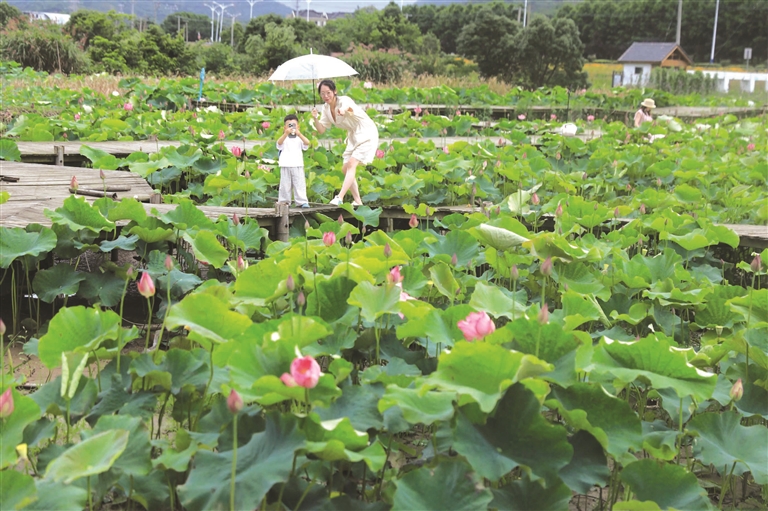 近日,普陀田园综合体禅莲精品园内,大片荷花陆续开放,美不胜收,吸引众多游人前来欣赏并留影