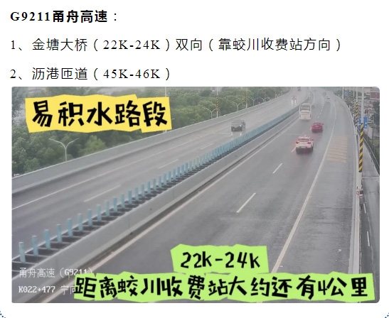 G9211甬舟高速易积水路段:金塘大桥(22K~24K)双向(靠蛟川收费站方向);沥港匝道(45K~46K)。