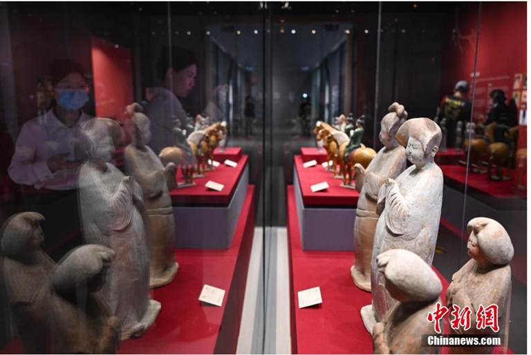 6月19日,唐代仕女俑等文物吸引参观者。当日,2024“丝绸之路周”在浙江杭州开幕,“九天阊阖:丝绸之路上的长安”同步开展,50余件一级文物集中亮相,呈现唐代长安的政治、经济和文化地位,展现唐代丝绸之路的宏阔历史及浙江与唐代丝绸之路的关联。据了解,2024年是“丝绸之路:长安—天山廊道的路网”跨国申遗成功10周年。中新网 图