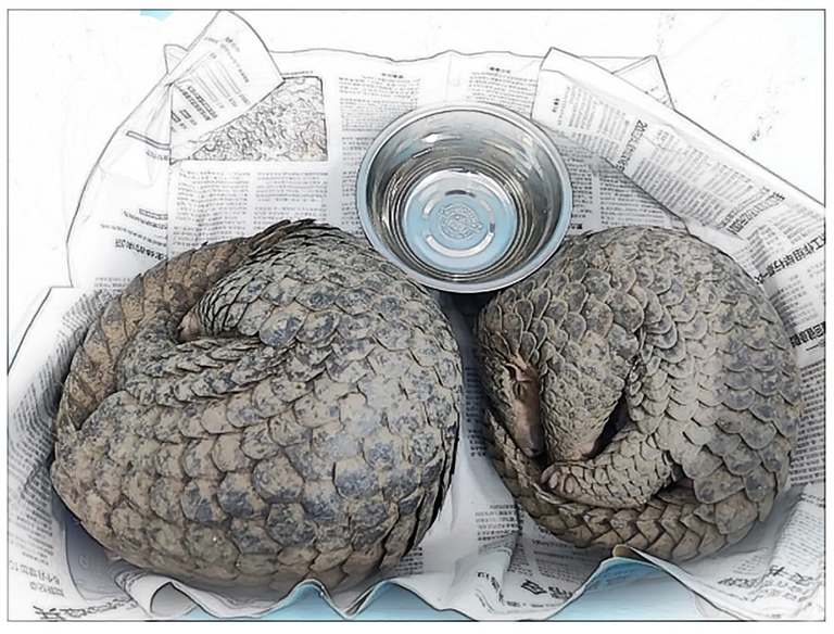 这两只穿山甲均为雌性,大的重4.75千克,长88厘米,没有受伤。小的经检查后发现鳞片有些许剥落,部分伤口长蛆虫,重2.95千克,长79厘米。