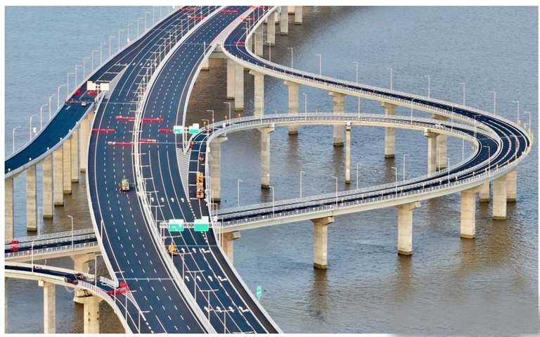 6月20日,记者来到世界级跨海集群工程——深中通道探访。深中通道是粤港澳大湾区核心交通枢纽工程,项目集“桥、岛、隧、水下互通”为一体,全长约24公里,是目前世界上综合建设难度极高的跨海集群工程之一。目前,深中通道已通过交工验收。图为深中通道立体交通。中新网 图