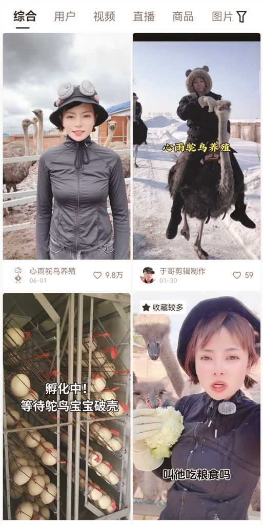 “大家好,我是心雨,身后就是我家养的鸵鸟……”最初的那段日子里,她像个蹩脚的演员,每天对着寥寥无几的观众默默演着独角戏。收获也有,比如她越来越熟悉鸵鸟养殖的点点滴滴,也越来越觉得鸵鸟可爱。