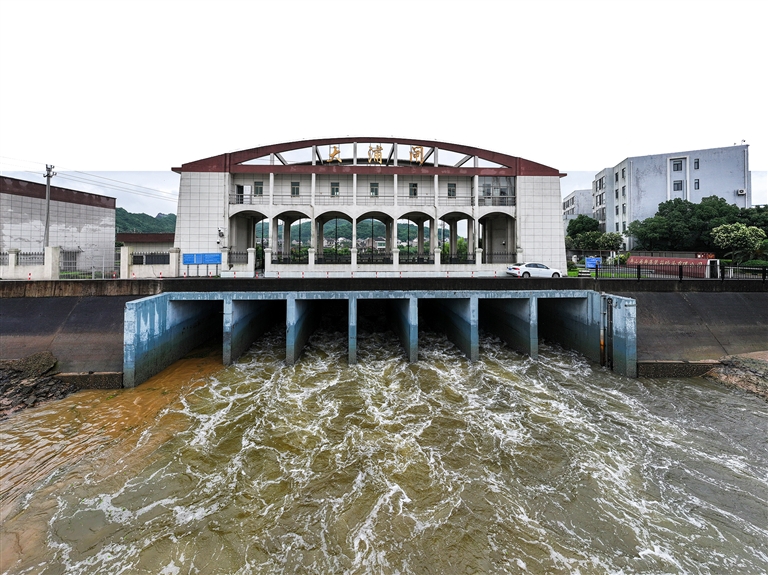 昨天傍晚,定海区金塘镇大浦闸开闸排水。堤内河水通过七孔碶闸奔腾入海,以保辖区安全。通讯员 姚峰 摄
