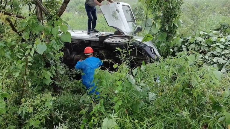 发现情况后,俞奇迅速叫上同行人员一起施救,有人拨打报警电话,还有人立即跳入草丛里,攀爬至侧翻车辆右侧车门上确认车内人员安全。因当时雨量较大,且车门因侧翻发生变形,经过多次尝试才打开车门,再次确认车内人员意识清楚、伤情不严重后,大家合力把被困车内的两名人员营救出来。