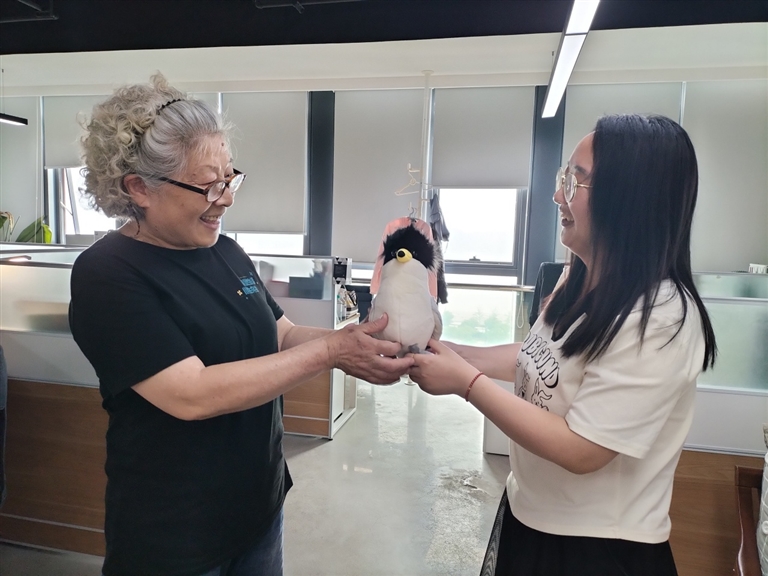 这位年过七旬的沈阿姨,是“竞舟”的铁杆粉丝,一直在关注我们的直播。看到小鸟宝宝顺利破壳出生,她很感动。上次给小鸟宝宝起名字,她和女儿积极参与,起名“凤起”,还幸运地抽中了中华凤头燕鸥玩偶。阿姨喜欢得不得了。