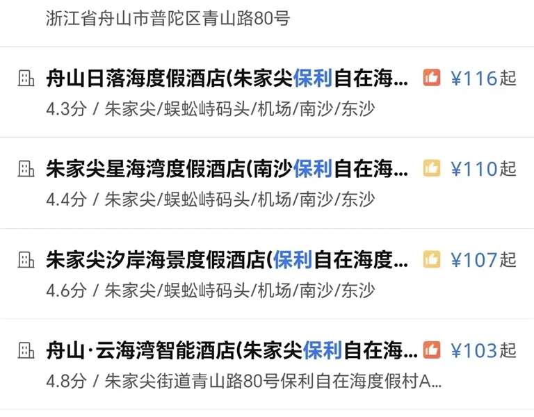 在朱家尖西岙一带,保利自在海的酒店式公寓已经开张。在“携程网”上可以看到,保利自在海周边的民宿,六月底的非周末客房,报价低至100元一晚,周末稍高,150元也能订到。