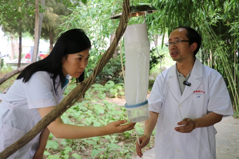 刘美德(右)和同事使用二氧化碳诱蚊灯法监测蚊虫密度