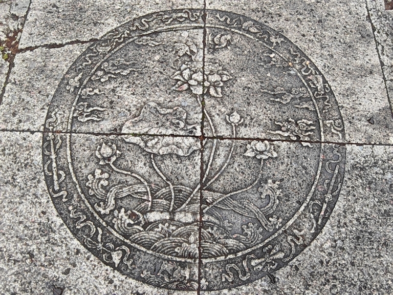 海会桥古地雕由四块石板拼成,中间是直径为145厘米的圆形。外圆边框内环绕着八仙的八件法器,除此之外,下方一只金毛犼立于海浪波涛之上,背鳍直竖,颇具威势。内圈圆形底部是海水江崖纹,一段荷藕生长其中。荷花、荷叶身姿摇曳,亭亭出于水面,其中一张荷叶上静静趴卧着两只蟾蜍,一朵花瓣重重,莲蓬饱满的荷花傲居最高处,两只翠鸟临空而来,“难舍荷色秀”,欲立莲蓬上。数朵灵芝祥云飘在天际。地雕雕工细腻,惟妙惟肖,表现出了极强的艺术美感,难怪百年前恩斯特·柏石曼来到普陀山,就与它邂逅结缘。