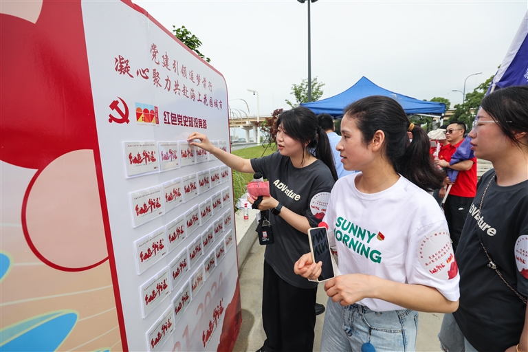 临城街道金鸡山社区近日在市民广场举行庆“七一”活动。社区大党委和10家结对单位党支部共100余名党员,现场参加党建知识竞赛等活动,共庆中国共产党成立103周年。