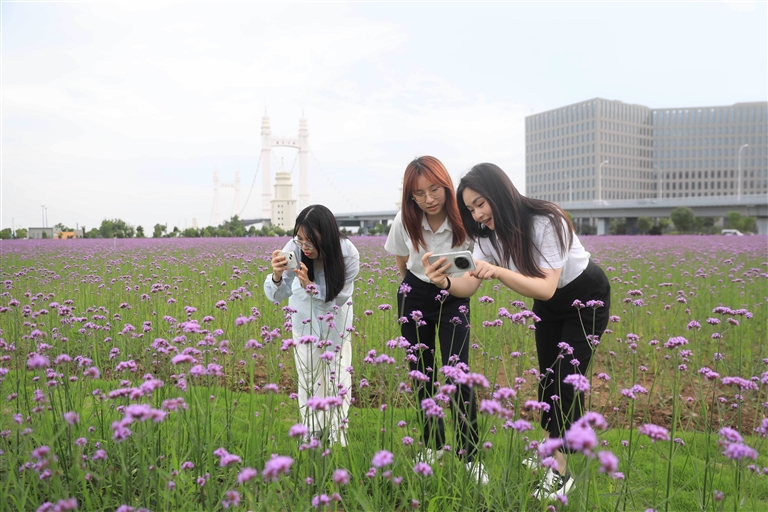 昨天,新城港岛大桥东侧、赛丽广场北侧,35000平方米马鞭草美丽绽放,迎来最佳观赏期,吸引众多游人纷纷前来打卡并留影