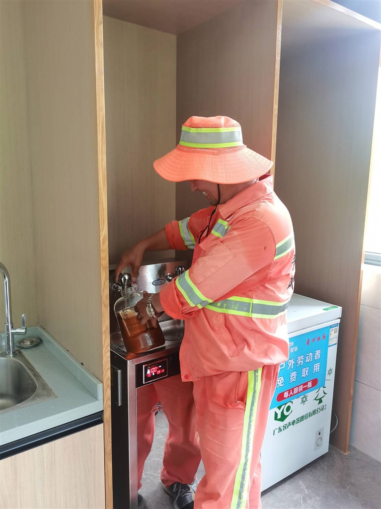 昨天上午10时左右,环卫工人张师傅走进普陀区兴港大道城管驿站,将水壶灌满凉开水,再打开冰箱,取了一瓶瓶装水。“今天有点晒,喝杯冰水凉快凉快。”