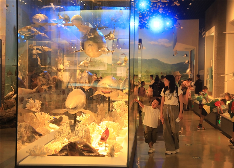 昨天,在舟山博物馆“蓝色宝库”展厅,来自温州的20余名小朋友正在家长的带领下开展亲子游活动,接受海洋文化的熏陶,丰富暑期生活