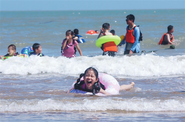 昨天,朱家尖南沙景区,游客们在沙滩上踏浪戏水,玩得不亦乐乎 记者 张磊 摄