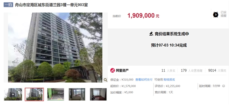昨天上午,定海兰园一套9楼126平方米带车位的房源,在阿里法拍平台以190.9万元的价格成交。