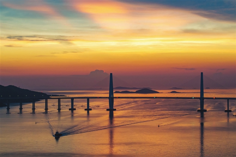 夕阳下舟岱大桥的剪影 图/陈炳群