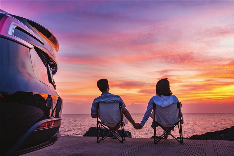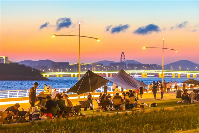 傍晚的小干岛晚风轻拂,市民露营观山海 图/张磊