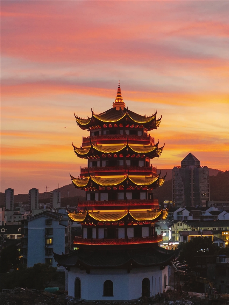 新建的定海奎光阁,夕阳下熠熠生辉 图/陈炳群