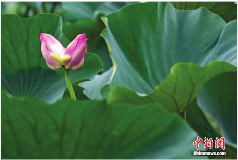7月9日,江苏南京,玄武湖一株并蒂莲含苞待放。并蒂莲属荷花中的千瓣莲类,即一枝荷花双萼并蒂,是植物种类中难得一见的“双胞胎”,以其独特的造型和美好的寓意受到民众喜爱。中新网 图