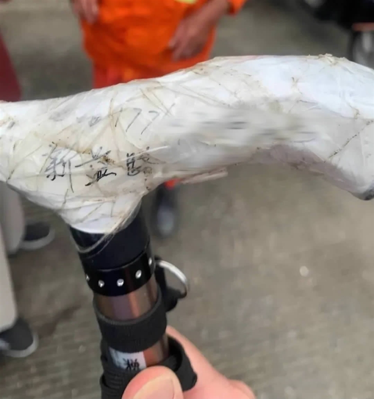 在检查老人是否受伤时,吴庭细心地发现,老人手中的拐杖上用透明胶带贴着一张纸条,上面写有一串号码和门牌号,这很可能就是老人的住址,但字迹有些模糊。