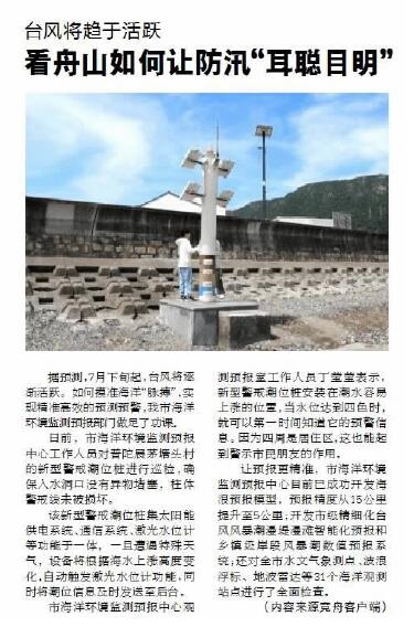 台风季即将到来,各项防汛工作正紧锣密鼓地推进。一种集太阳能供电系统、通信系统、激光水位计等功能于一体的新型警戒潮位桩已安装到位,一旦水位上涨就会第一时间发出预警信息。智慧防汛可以更加精准到位,诸如此类的“神器”多多益善。