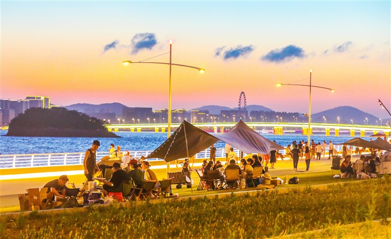 新城小干岛晚风轻拂,市民或漫步海滨,或搭帐露营,享受纳凉休闲的时光 记者 张磊 摄