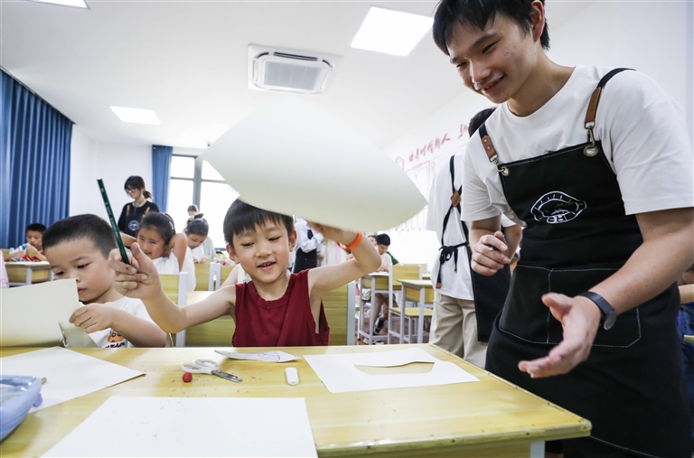 7月11日,定海昌国街道合源社区组织辖区青少年开展暑期纸版画体验活动。浙江海洋大学的大学生们手把手教小朋友们制作版画。纸版画新奇的表现形式既开拓了孩子们的视野,也丰富了他们的暑期生活。记者 张磊 通讯员 刘英 摄