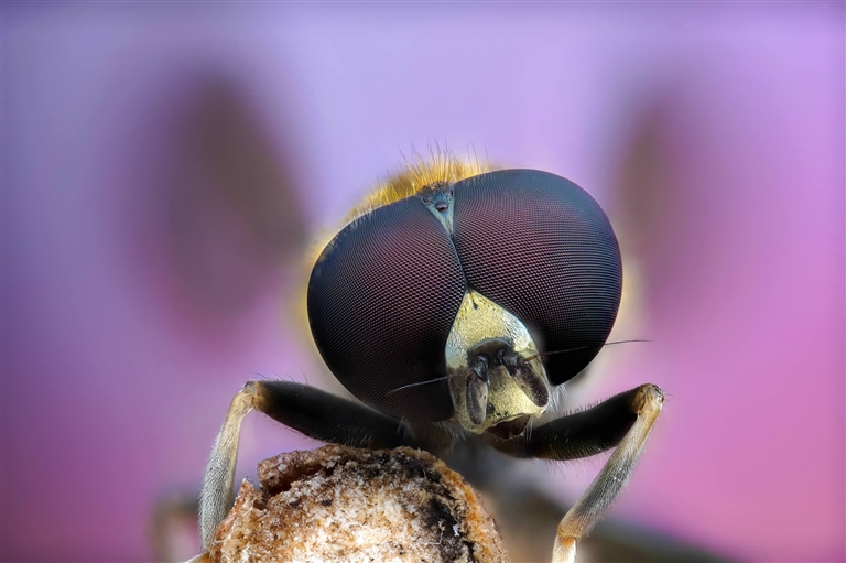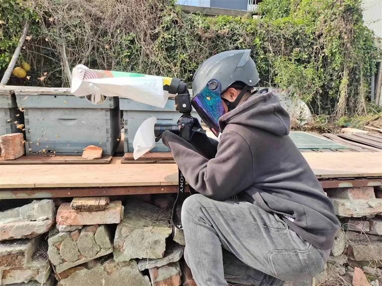 他还拍过一只正对着镜头的蜜蜂,似乎这只蜜蜂知道有镜头要拍自己,成了一个配合的模特,“你看这是蜜蜂的单眼和复眼。”