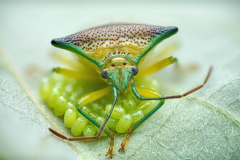 野外拍摄不易,但却能捕捉到很多有意思的瞬间。“你看这个和绿葡萄一样的卵,就是椿虫也就是臭虫的卵。”葛恩嘉向记者展示道。