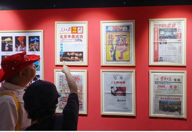 7月13日,正值北京申奥成功23周年纪念日,北京收藏家协会联合北京体育历史文化展览馆推出的“盛世辉煌看奥运”北京双奥典藏展览开幕。此次展览展出800余件京城体育藏家的珍贵奥运收藏品。图为观众参观北京申奥成功后各家报社的号外。中新网 图