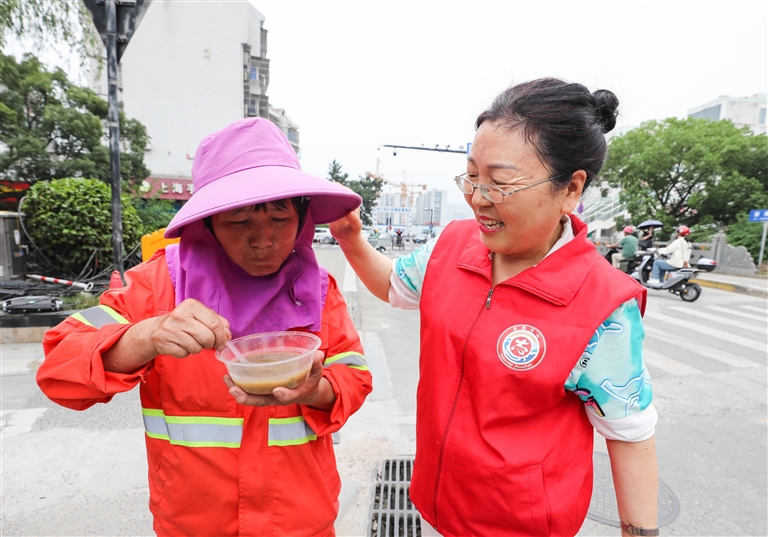 近日,定海美之声演唱团的志愿者来到定海东门车站、环城东路及附近工地,向旅客、环卫工人和建筑工人送上一碗碗绿豆汤,消暑解热 记者 张磊 摄