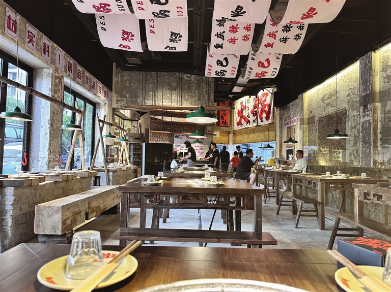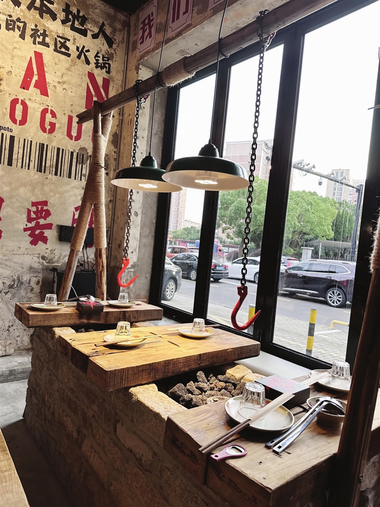 步入,是个大的厅堂空间,一张张八仙桌上架着火锅,几面硕大玻璃窗临街的位置,则是砖窑形式的吊锅。迎面的白墙上,洋洋洒洒地写着关于火锅的几行大字“重庆本地人都吃的社区火锅”,一语点睛。