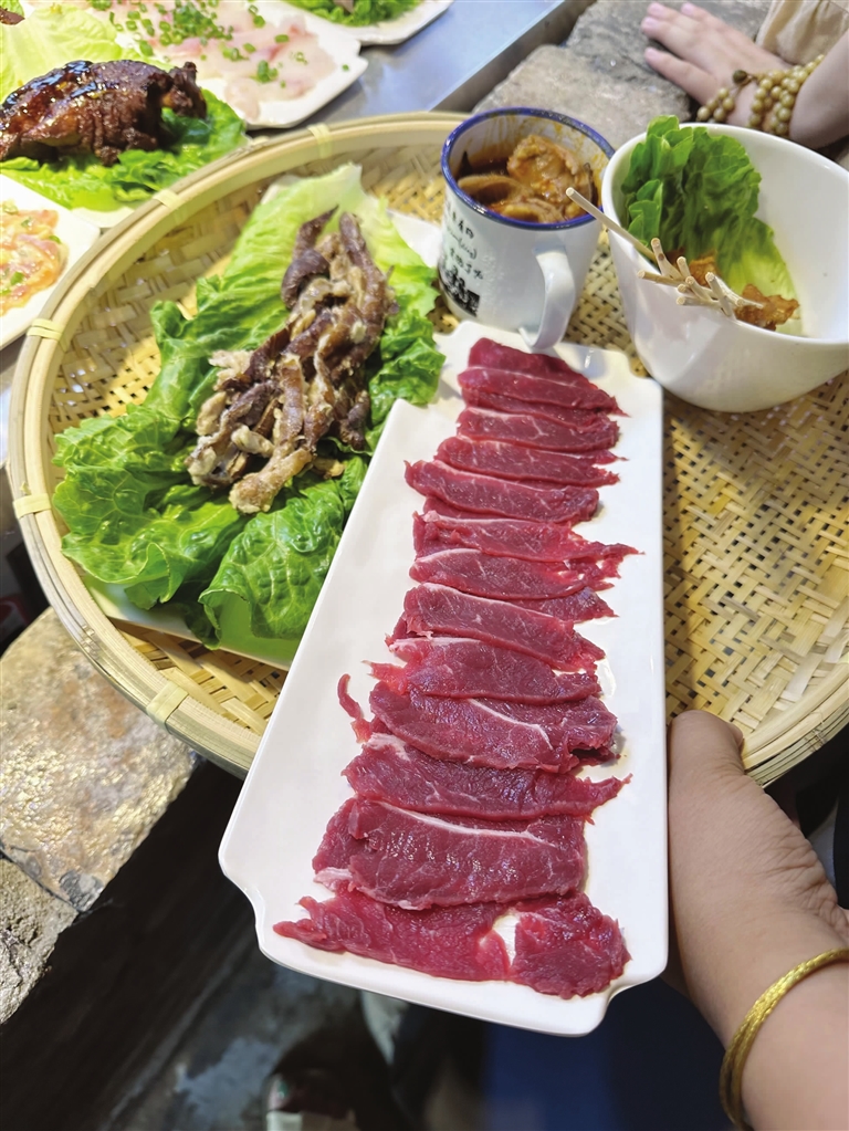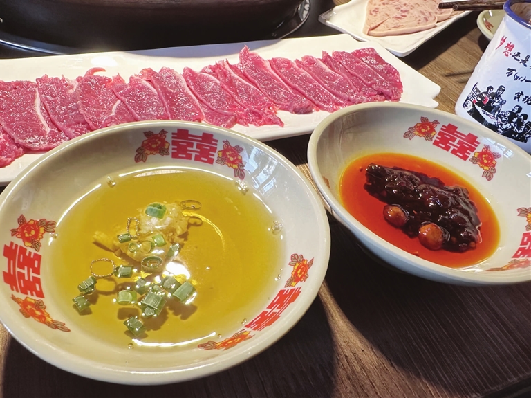 要了毛肚,要了鲜切牛肉,要了卤好的大肠、猪蹄,要了黑豆皮,想要的太多,候在一旁一盆一盆搬上桌。显然红油热锅比清汤白锅沸腾起来要更猛烈一些,一股牛油香气扑面而来,忙不迭地夹上肉片往热锅里放。没有蘸料直接送嘴里的牛肉一样好吃,在涮锅的时候相当于已经调上了味,肉片饱吸汤汁,微辣浓香,有滋有味。