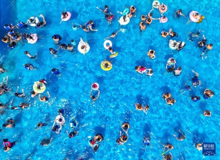 7月14日,人们在湖南省永州市道县一水上公园戏水消暑(无人机照片)。