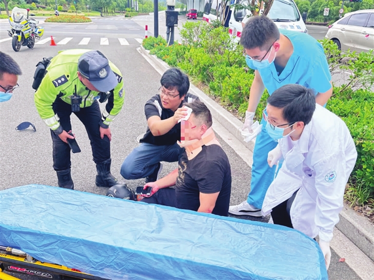 在等待急救车到来的过程中,廖海东始终守护在伤者身边,持续做好伤口止血处置并不断鼓励伤者保持意识。五六分钟后,急救车和交警赶到现场,廖海东又协助医护人员将伤者抬上担架,送上急救车。及时有效的应急救护,为伤者争取到了宝贵的救治时间。目前,伤者正在医院接受治疗,生命体征平稳。