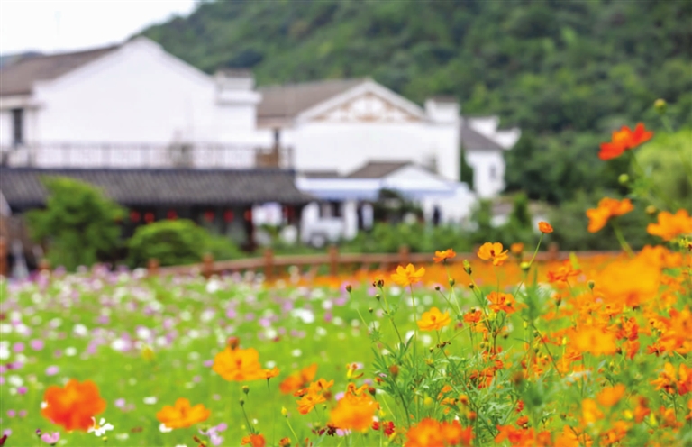 七月的定海南洞艺谷,硫黄菊、百日草、波斯菊等各色花卉在阳光下绽放,远远望去犹如洒落的调色板,缤纷多彩。