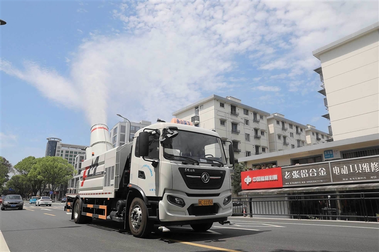 昨天,一辆新型环卫车——多功能抑尘车亮相定海城区道路,车辆驶过,在其喷淋的水雾作用下,为城市道路带来一片凉意和洁净。据了解,该车辆具有除尘、降温、改善空气质量等功能。 记者 陈永建 摄