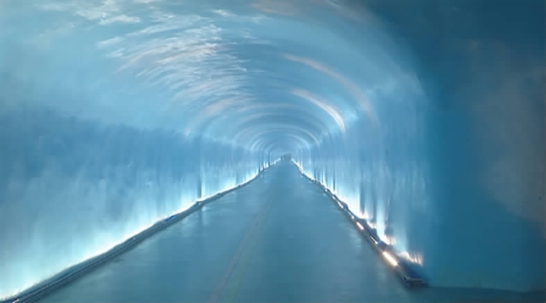 其全长960米,其中423米是新建的,537米是由原来的人防工程改造而成。洞内,顶部是蓝天白云,墙面内嵌的霓虹灯不停闪烁,向里走还有全息投影。作为连接着海山公园和草子坑水库的通道,该纳凉点全天开放,市民随时可以进入。