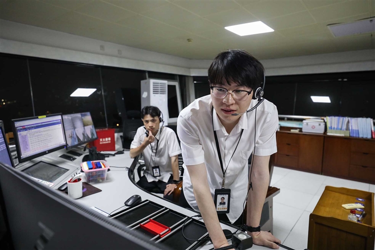 30平方米大小的指挥室内,坐在指挥台正中央管制席上的黄书哲戴着耳麦,双眼紧盯屏幕,一句句指令干脆清晰、掷地有声。