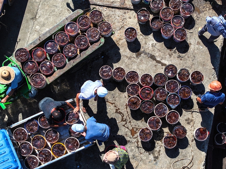 昨天中午11时许,定海区金塘镇获批海蜇专项特许捕捞资格的渔民们驾船驶往洋地,经过3小时左右捕捞,满载海蜇返航。渔民们顶着骄阳把一桶桶刚捕获的海蜇卸上码头。据了解,今年的海蜇专项特许捕捞时间从7月12日开始,为期15天。渔民介绍,由于今年上半年长江口流域雨水多,适合海蜇生长,所以今年的捕捞期比往年提前,产量也高于往年。通讯员 姚峰 摄