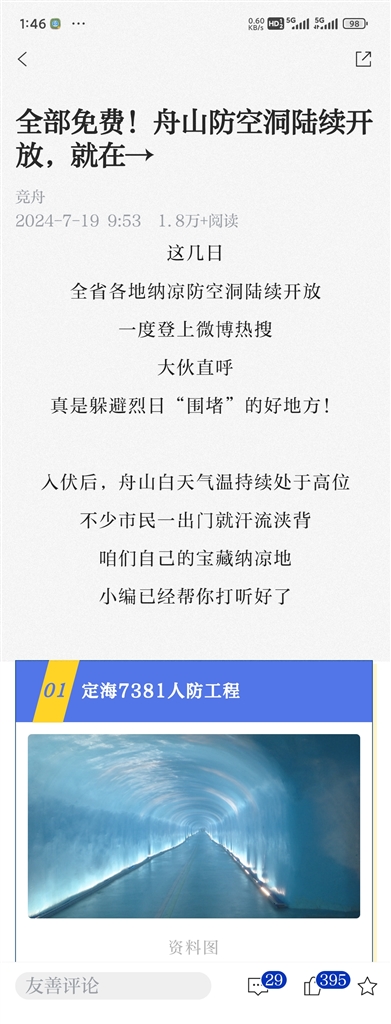这几日,全省各地纳凉防空洞陆续开放,一度登上微博热搜。据记者打探,舟山也有自己的宝藏纳凉地:在定海东海云廊草子坑水库附近的定海7381人防工程,全长960米,常年对市民免费开放;普陀青龙山人防工程纳凉点正在修缮,在纳凉的同时,还能下棋、看电视、打乒乓等,计划于7月25日左右对外开放。