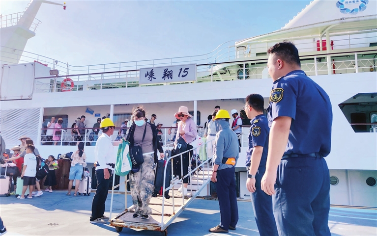 目前正值暑期海岛旅游旺季,前往嵊泗列岛度假的游客络绎不绝。根据台风动态和发展趋势,海事部门及时启动偏远海岛疏客工作,截至昨天下午3时,包括花鸟、嵊山、枸杞等偏远海岛在内的嵊泗列岛共安全撤离游客超2万人次。记者 王倩倩 通讯员 方祥光 摄