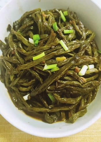 洗净切段的带豆入油锅,尽量两边都翻透,之后加酱油、糖、醋,转小火,加盖焖一会。此时会看到,锅里慢慢地渗出不少水来,用小火焖着带豆,烤到水分收得差不多了,关火即可。