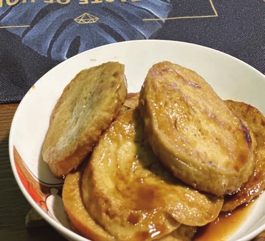 小记也照着他的方子上手过两次,确实挺好吃,大夏天吃起来不似肉那么腻,滋味还挺足。到菜场上切一块素鸡,自己在家分切的时候不能切太薄,差不多一厘米左右的厚片。开油锅,素鸡下锅开炸,因为切得较厚,所以小火开炸时间要稍久一些,把每一片都炸透了。
