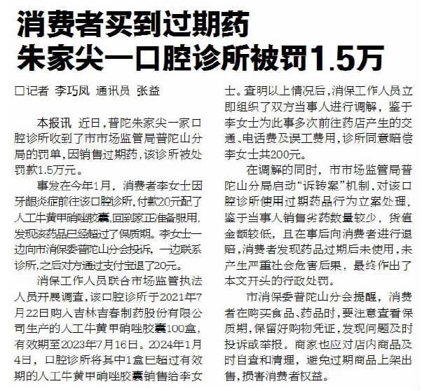 近日,普陀朱家尖一家口腔诊所收到了市市场监管局普陀山分局的罚单,因销售过期药,该诊所被处罚款1.5万元。