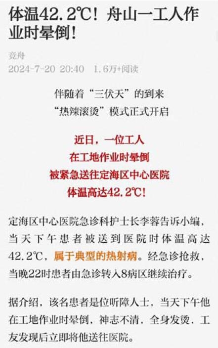 日前,一位中暑晕倒在工地的工友被送到定海区中心医院急诊科抢救。该工友入院时神志不清,体温测不出Hi值,估计在42.2℃以上,生命体征极度不稳定,属于“热射病”症状。所幸,经过快速补液、物理降温及吸氧等抢救措施,患者生命体征逐渐平稳。虽然有惊无险,这一“热射病”病例仍给全社会敲响了一记警钟。