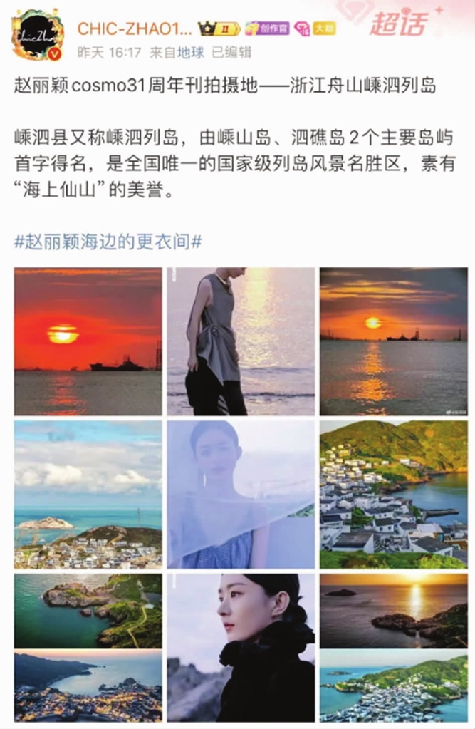 7月23日,演员赵丽颖微博发了一组在海边拍摄的美照,粉丝和网友纷纷猜测拍摄地。小编可以骄傲地告诉大家——就在咱们舟山嵊泗。